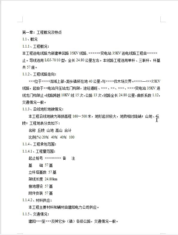 本工程送电线路为新建单回路35KV线路, ××××××变电站35KV送电线路工程由×××××止。导线选用LGJ-70/10型,全长24.80公里左右。本线路工程选用单杆、三联杆,杆基共57座。